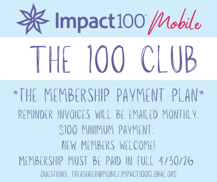 Please mail checks to: Impact100 Mobile, P. O. Box 160751, Mobile, AL. 36616